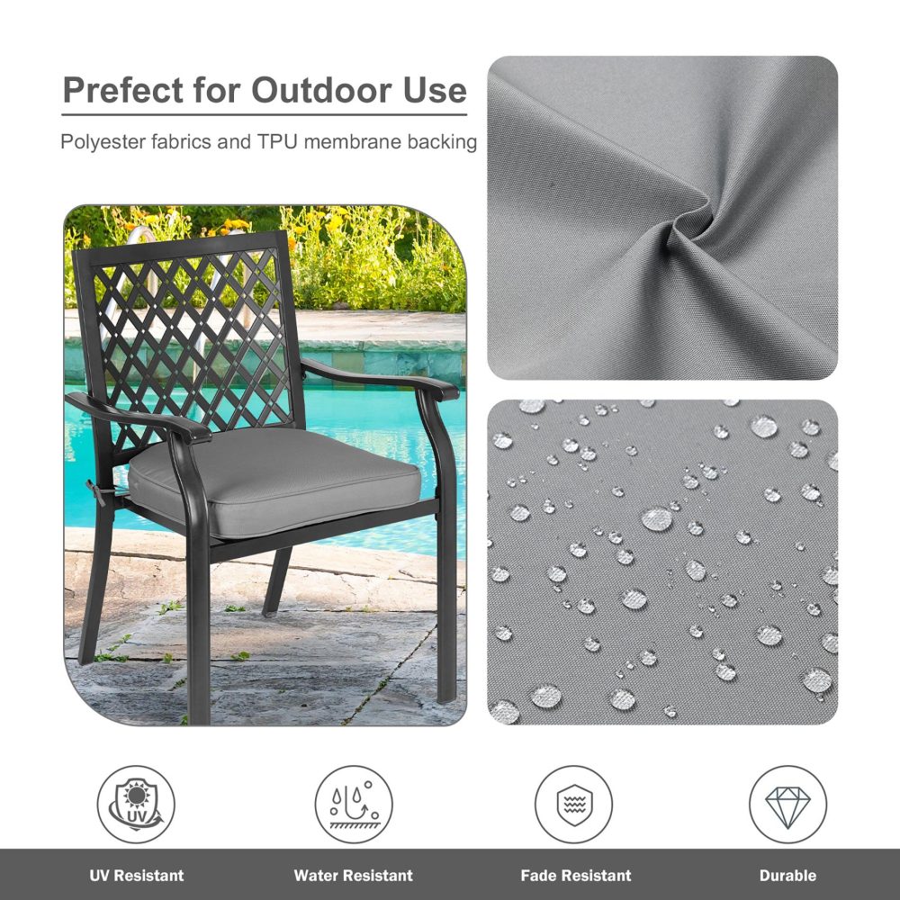 - Fade-resistant Polyester: Engineered to withstand the elements, chair cushions are fade-proof and built to last. The 100% polyester material is resistant to fading, ensuring vibrant colors and long-lasting durability, even after prolonged exposure to sunlight and outdoor conditions.